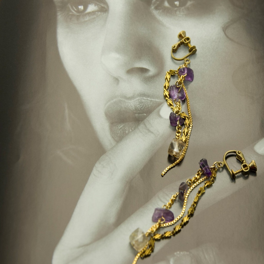 絕色系列-黃色托帕石與紫水晶 黃銅工藝耳夾