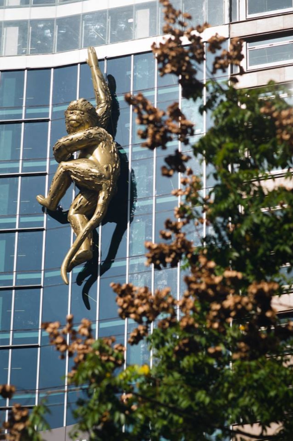 其實很多藝術家都有透過作品提出這個問題,希望人類自己能夠反思一下。大家最近有去過中環嗎?有否抬頭看過附近的環境?其實自12月起,香港設計中心 Hong Kong Design Centre 的 BODW 城區活動夥伴節目,已邀請了來自澳洲的藝術家Lisa Roet,帶同高達14米的充氣雕塑《金猴》來港,攀附離地75米位於中環砵典乍街H CODE 高空外牆。