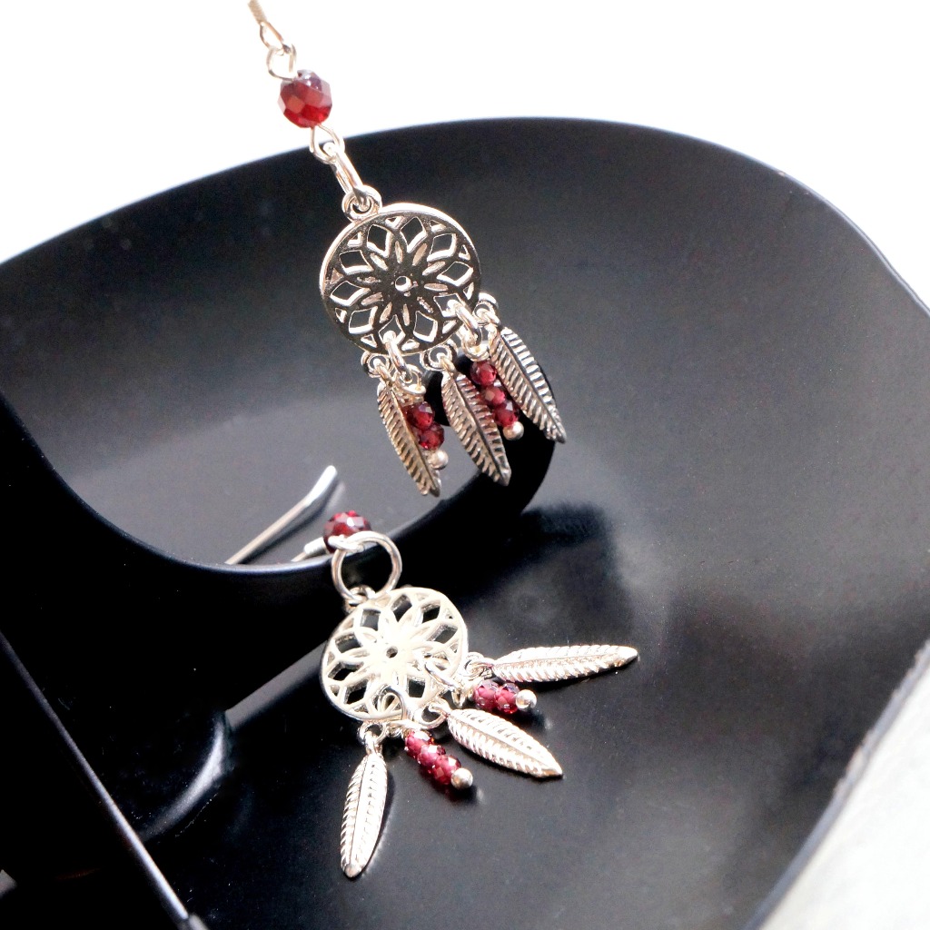 ♥ 純銀捕夢網吊著羽毛絛和晶瑩透明石榴石,可活動搖擺,温柔典稚。