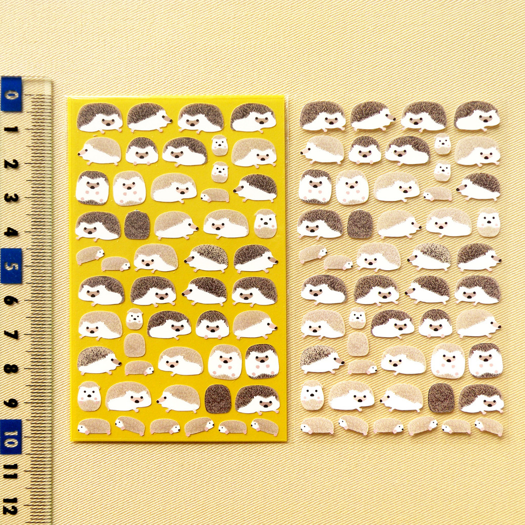 整份貼紙尺寸為 6cm(w) X 10cm(h)。 左邊刺蝟貼紙,每隻大刺蝟高8mm至10mm,刺蝟BB高4.5mm至6mm。 右邊迷你刺蝟貼紙,每隻刺蝟高4mm至7.5mm。 防水貼紙